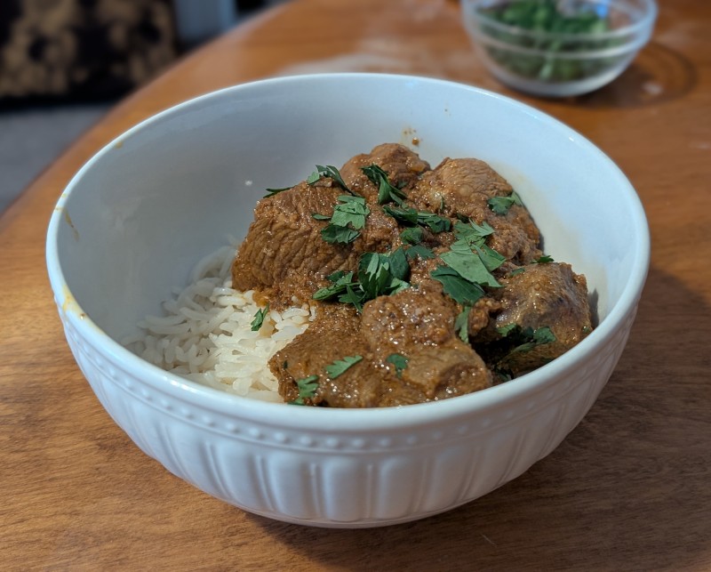 A bit less spicy than regular vindaloo, this is tender meat in a rich curry with flavorful peppers and warming spices.