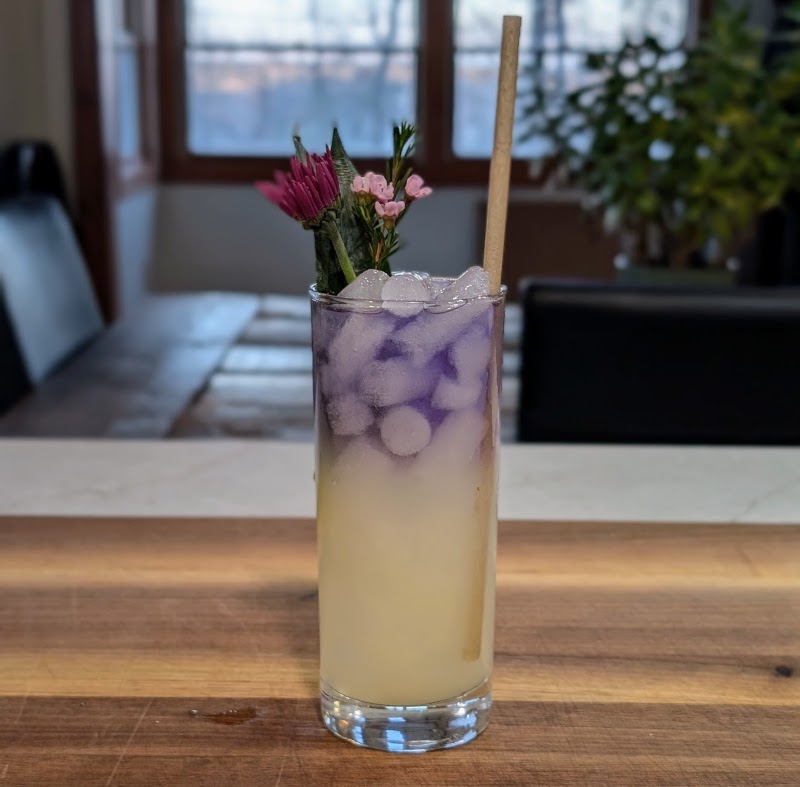This is a very pretty version made with Empress 1908 Gin, which has a lovely indigo color. All the ingredients other than the Empress are shaken together, and poured over ice. The Empress is floated on top, making a really pretty gradient of indigo into gold.